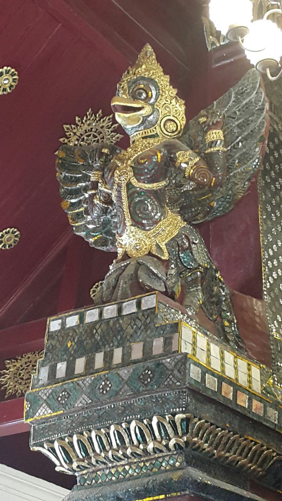 Garuda in the Ubosot of Wat Phra Mahathat Woramahawihan has 2 figures named Thao Wirunsang perched above the staircase on the left and Thao Tattaratharat is at the foot of the stairs on the right. Which is a beautiful sculpture